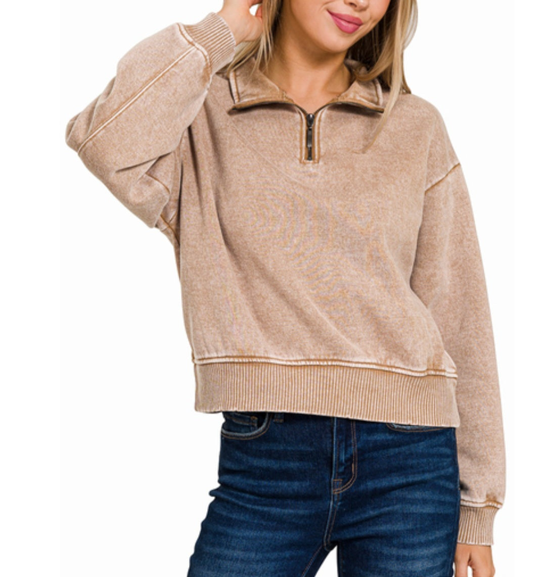 *Mineral Wash Fleece Half Zip Pullover in Deep Camel. Each Item is Unique~Expect Variations in Color and Finish