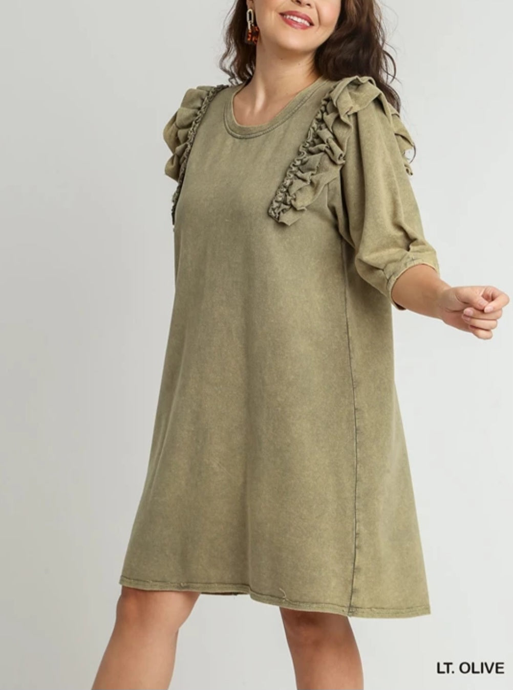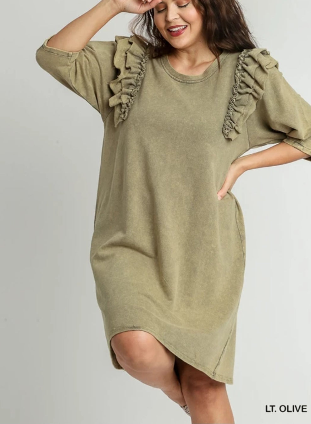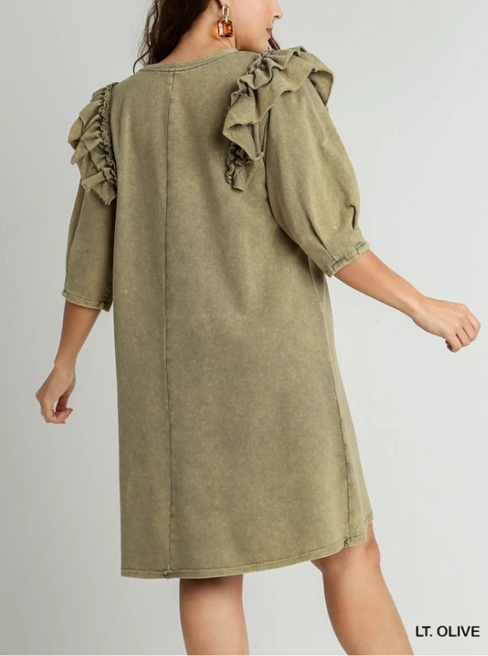 *Mineral wash French Terry Dress, Ruffle details with Pleated Detail Sleeve