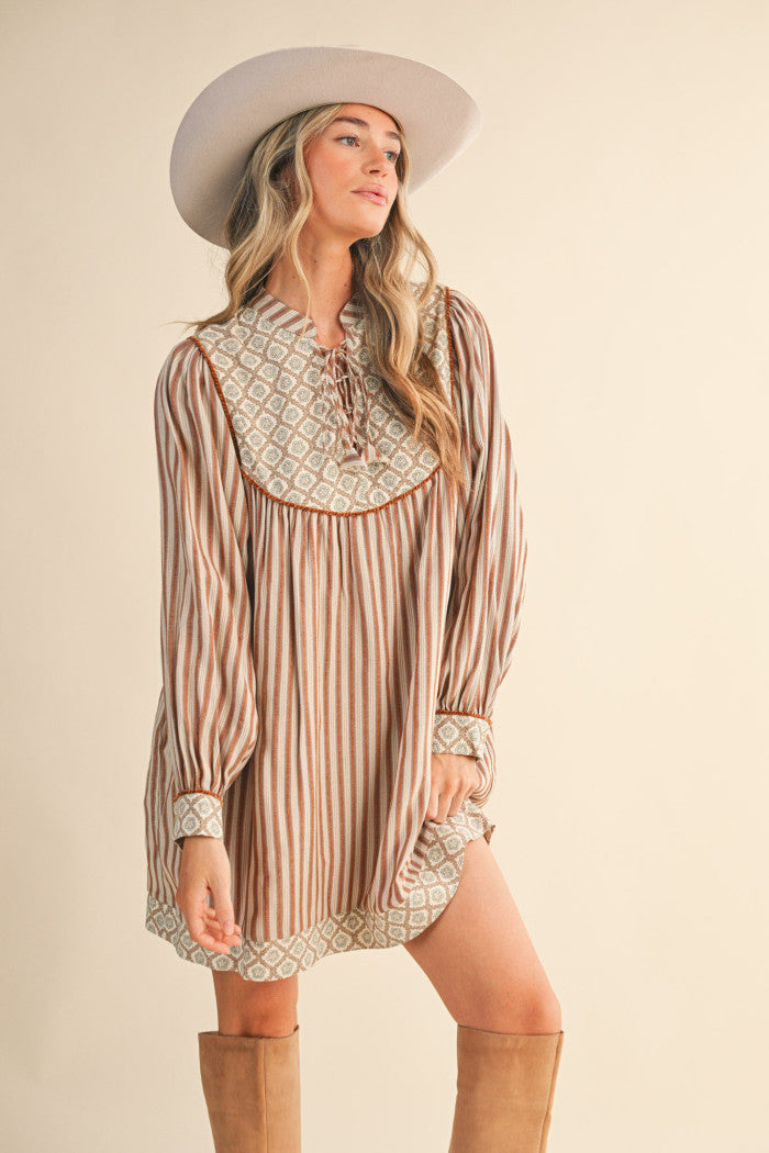 *This striped mini dress with floral yoke will be your favorite ensemble this season! Striped fabric shapes this lovely Fall dress with a lace-up V neckline, long puff sleeves, and floral buttoned cuffs. Contrast floral print shapes the front and back yoke with velvet piping trim along the edges.