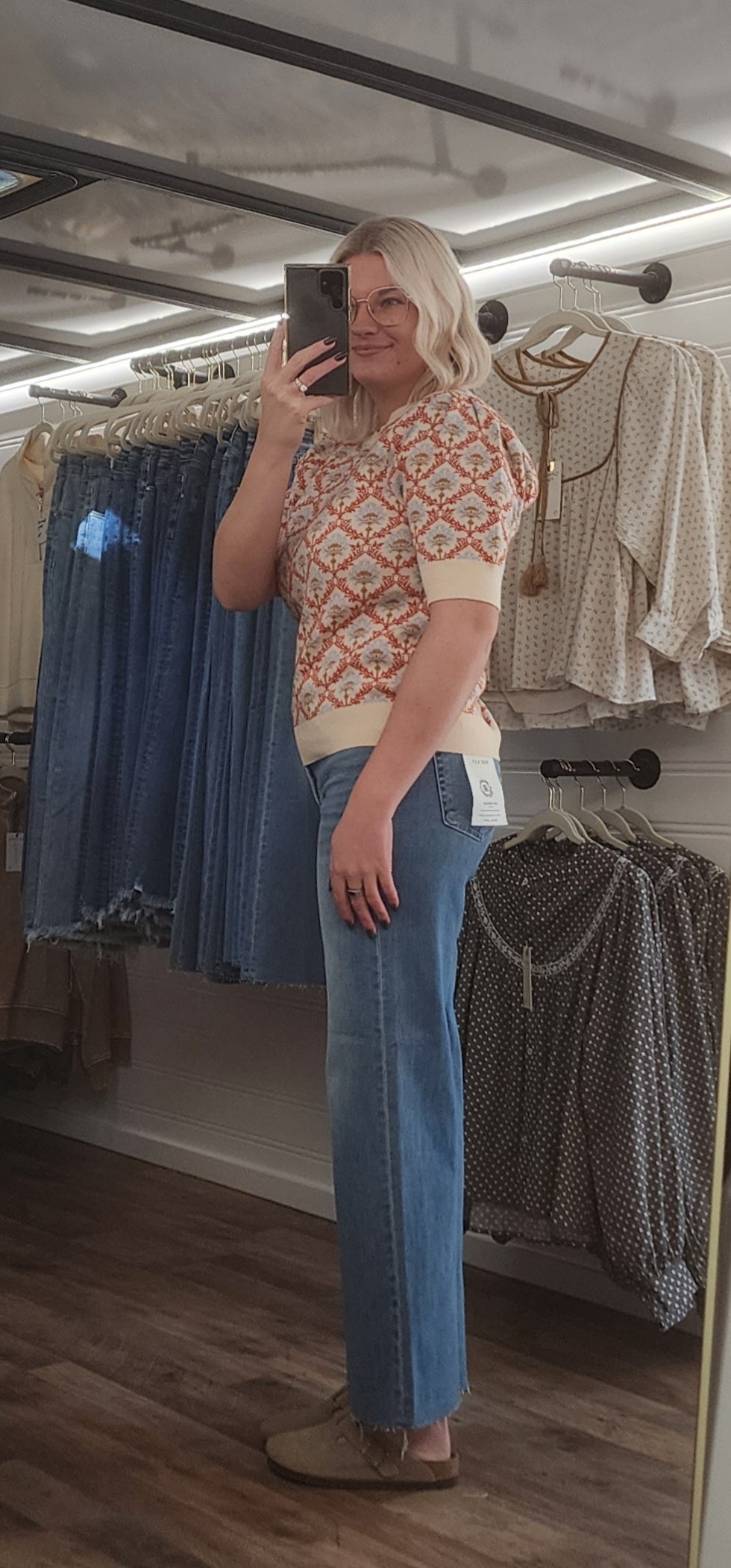 *A charming aesthetic is easy to achieve when you have this multi-colored floral pattern short sleeve sweater! Soft sweater knit, in a floral knit pattern throughout, shapes this sweater top that has a round neckline framed by short puff sleeves. Ribbed knit accents the neckline, cuffs, and hem.